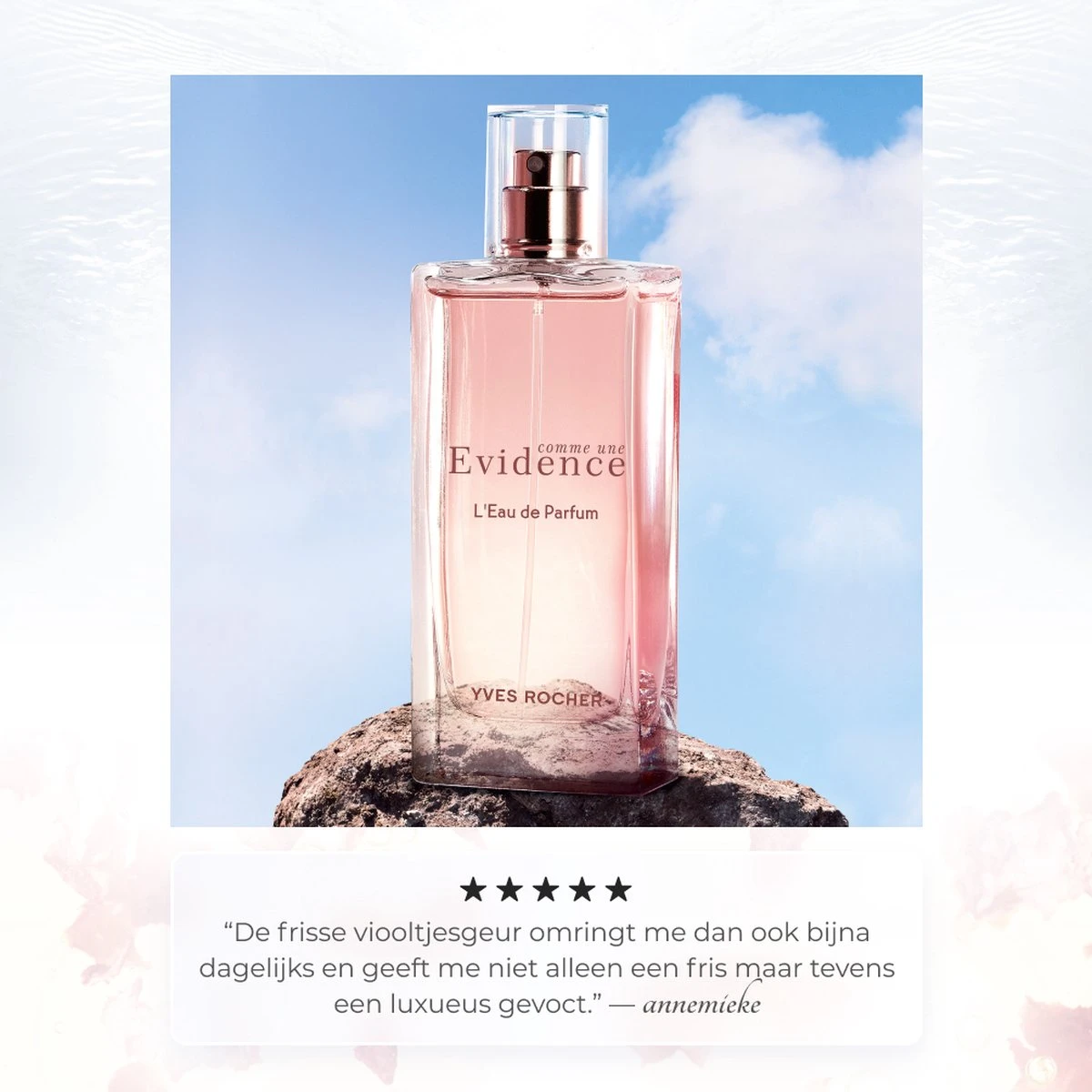 “Ik wilde een met licht overgoten parfum met een oneindig ruimtelijk gevoel creëren: een drastisch gemoderniseerd chypre-akkoord dat elegant en tijdloos is. De verfijnde frisheid van Bergamotessence maakt vrij baan voor de subtiel vrouwelijke nasleep van absolue van Damascusroos. De kalmerende accenten van Patchoeli-essence brengen tot slot een intens gevoel van volmaaktheid teweeg.”